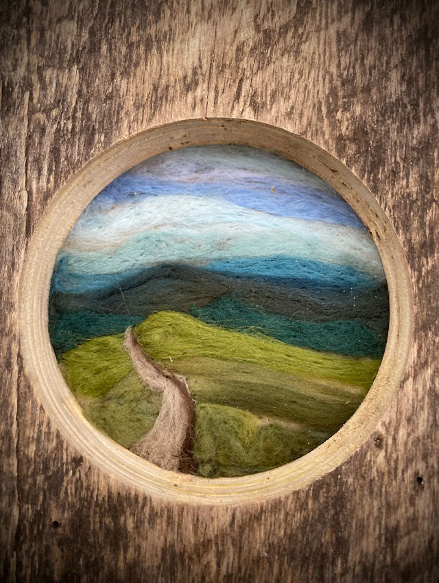 We will gather around a communal table with piles of soft colorful wool roving, pre-made rustic wood frames, and watercolors as templates. No art experience required – I will guide you through the process of painting with fibers and a needle.