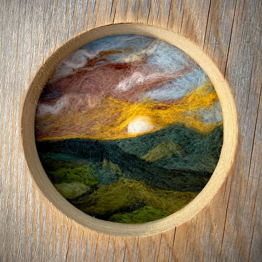Explore the creative galaxy of wool painting. We will gather around a communal table with piles of soft colorful wool roving, pre-made rustic wood frames, and watercolors as templates. No art experience required – I will guide you through the process of painting with fibers and a needle.