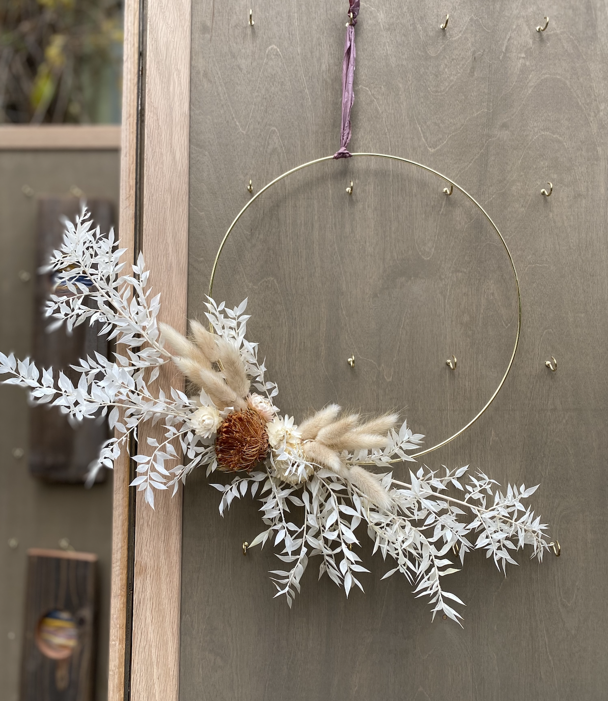 We will play with dried & foraged materials and vine wreaths & metal hoops to create fun decorations.